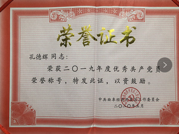 集團(tuán)下屬辰宏醫(yī)療科技有限公司總經(jīng)理孔德輝被授予二零一九年度共產(chǎn)黨員榮譽(yù)稱號(hào)!我們一定要珍惜榮譽(yù),戒驕戒躁、再接再厲、再創(chuàng)輝煌!為發(fā)展曲阜經(jīng)濟(jì)做出更大的貢獻(xiàn)!